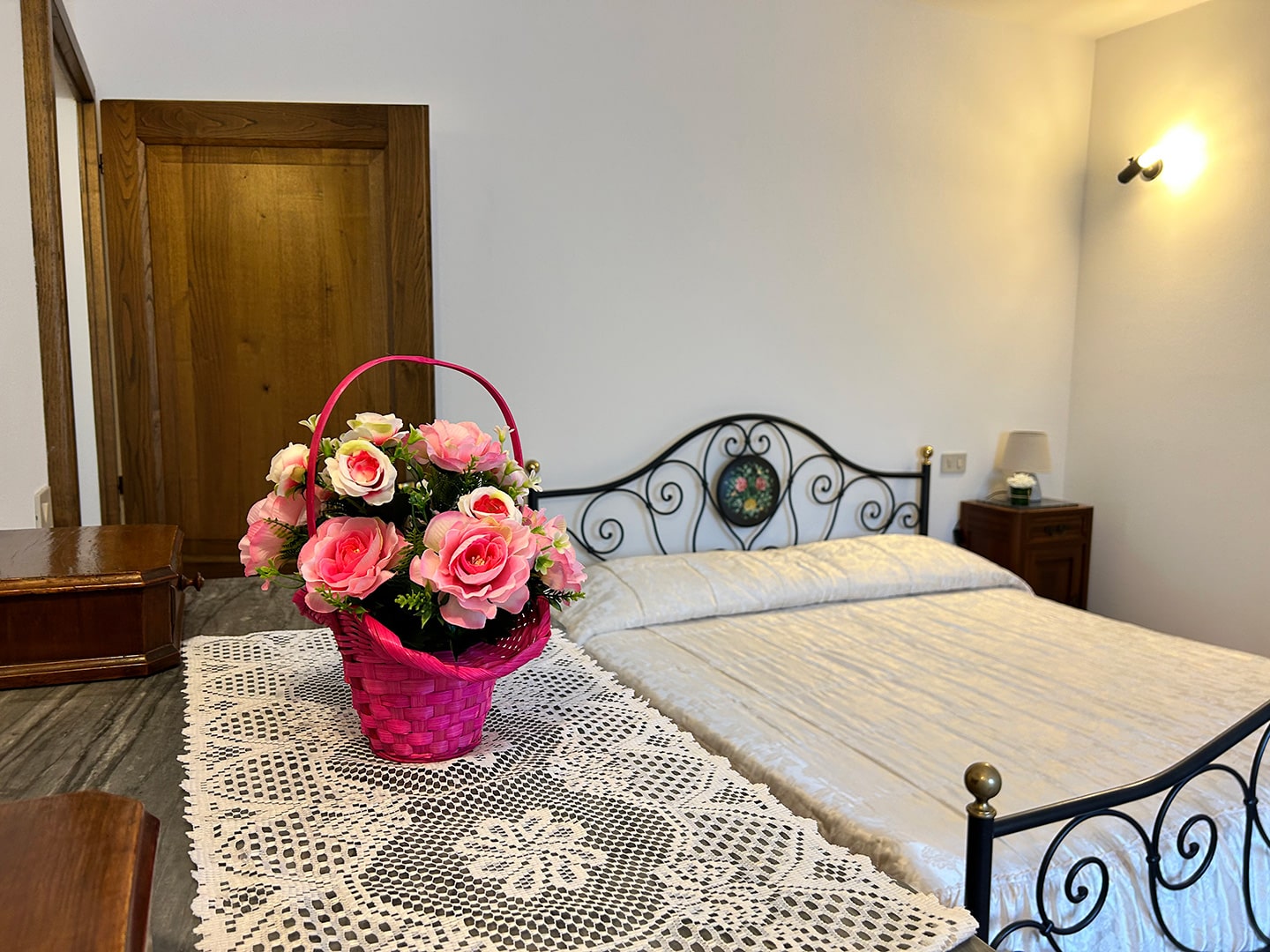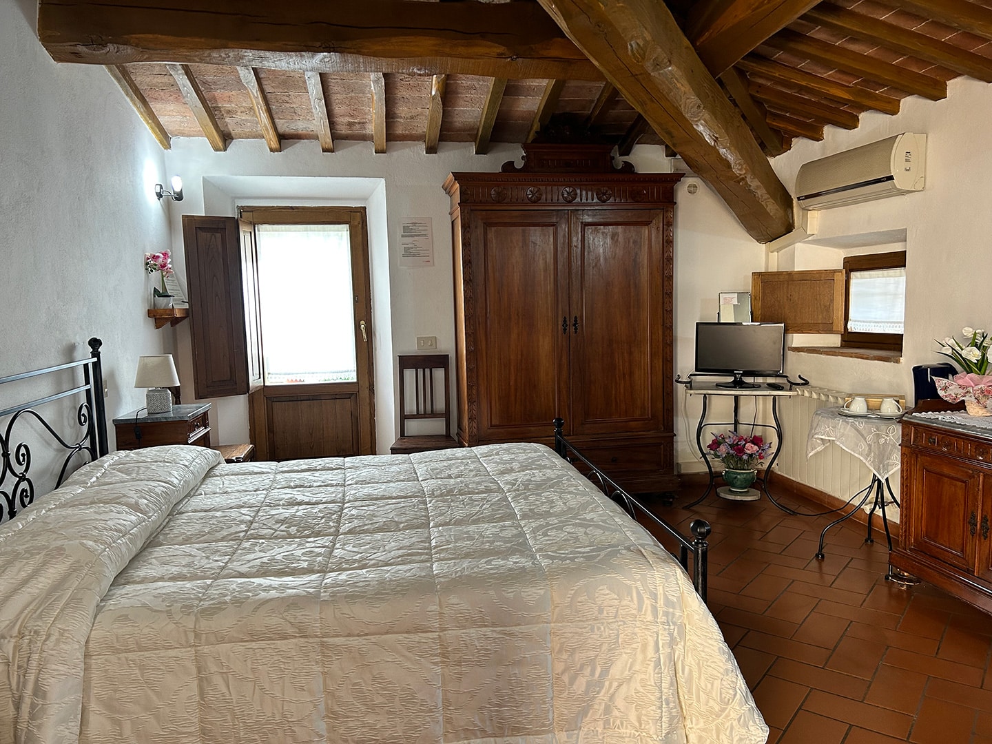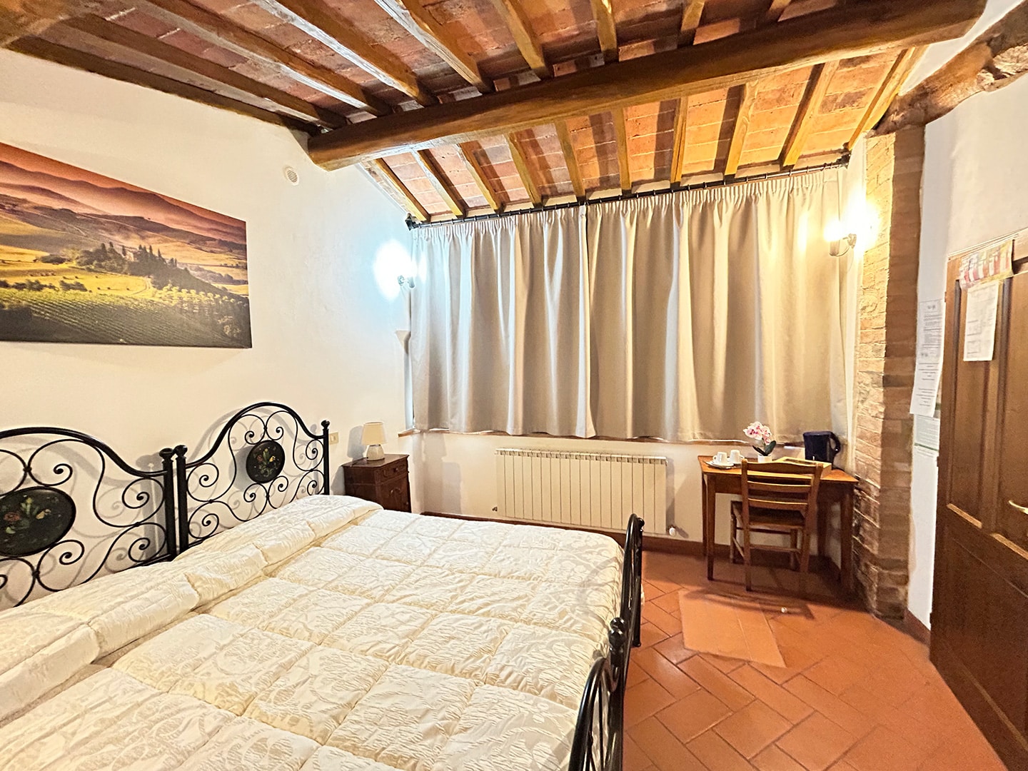 Camera luminosa affacciata sul verde, perfetta per chi cerca silenzio e relax. Ambiente accogliente con bagno privato, ideale per un soggiorno autentico in agriturismo tra Pienza e Val d’Orcia.