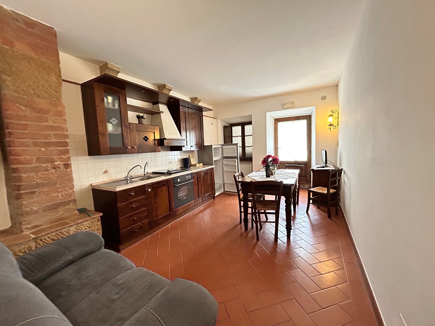 Appartamento spazioso con cucina attrezzata e ambienti in stile rustico toscano, ideale per soggiorni in autonomia. Perfetto per famiglie o coppie che cercano comfort e tranquillità in agriturismo nella Val d’Orcia.