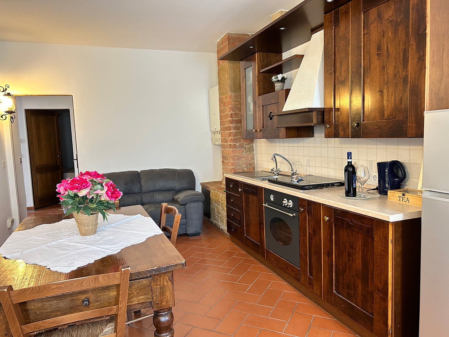 Accogliente appartamento con cucina e zona living, caratterizzato da materiali tipici e atmosfera calda. Una soluzione ideale per vivere un soggiorno in Toscana tra relax, natura e libertà.