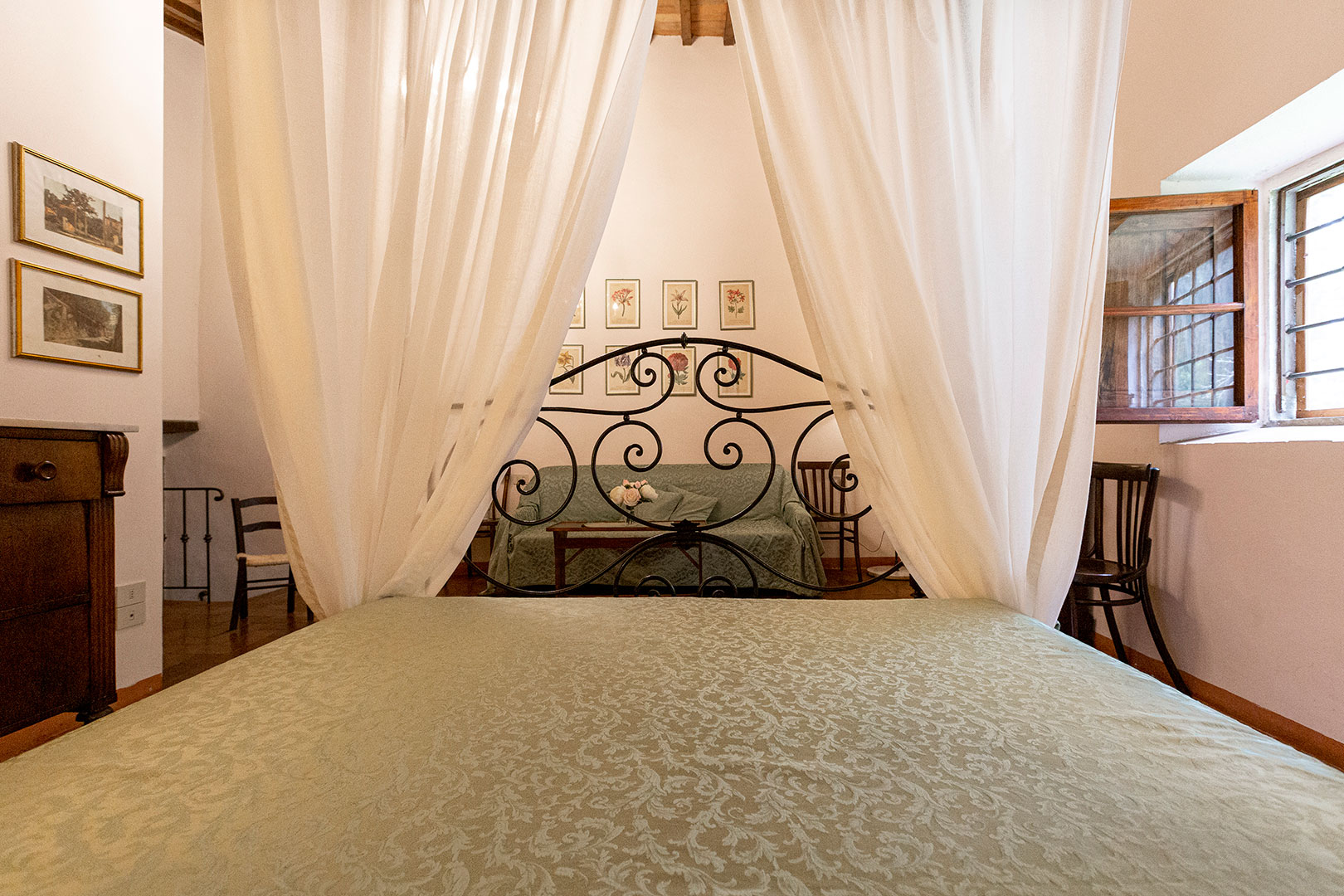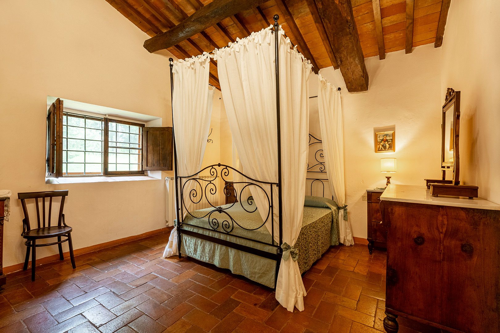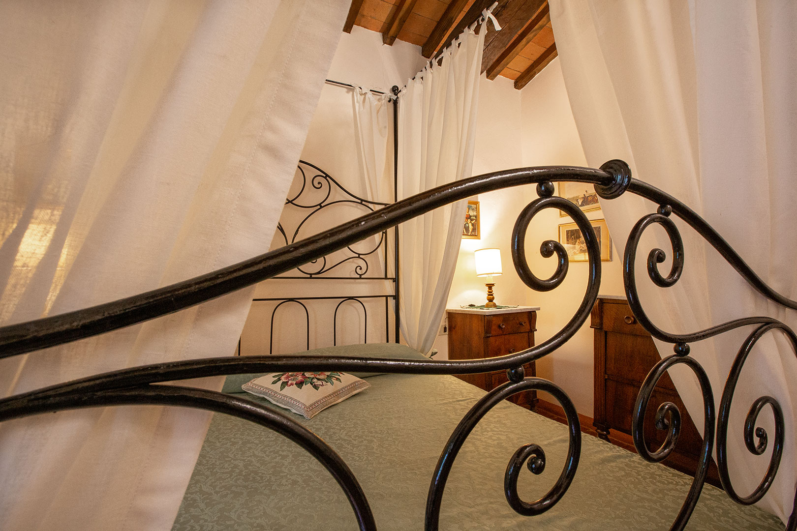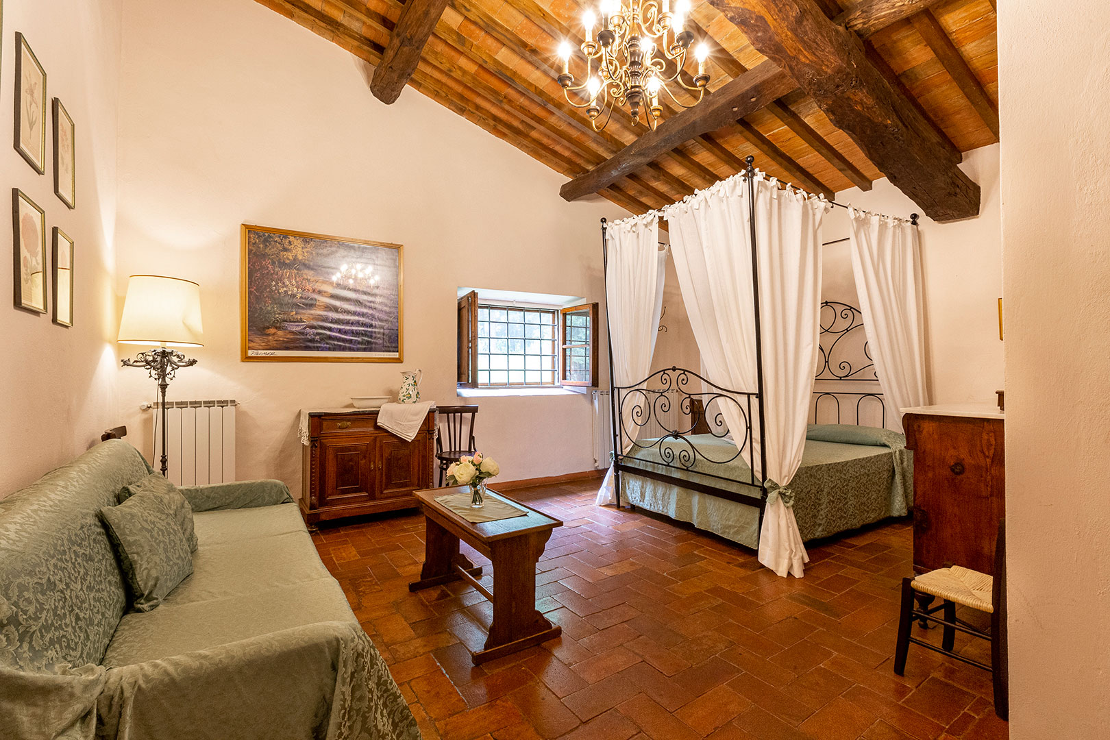 Villa Montagna è stata una casa contadina con stalle al piano terra che risale al 1629. Alla fine degli anni ’90 è stata ristrutturata per diventare una villa rustica che riporta al fascino di un tempo ormai lontano. Il giardino e la piscina, caldi e soleggiati la mattina, freschi e silenziosi la sera, offrono un panorama mozzafiato. Disposta su due piani risulta essere un’ottima location per una vacanza di gruppo con parenti o amici. Infatti, la villa può alloggiare massimo 18 ospiti distribuiti in otto camere da letto (tre delle quali con bagno proprio, con altre tre docce e wc in comune sul corridoio), un grandissimo salotto, stanza giochi, un piccolo angolo di lettura e un’ampia cucina con terrazzo sul retro. Abbiamo mantenuto, dove possibile, i pavimenti in cotto originale e in pietra serena di Firenzuola, le travi a vista e l’originale acquaio in pietra. Le camere sono arredate mantenendo lo stile antico colonico di fine ’800 – inizio ’900. Villa Montagna è un posto speciale per godere sia della bellezza unica del Mugello che della vicinanza con gli altri tesori della Toscana.